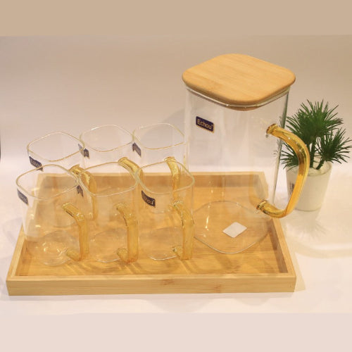 Elevate your beverage service with the exquisite 8 Pcs Glass Pitcher Set with Wooden Lid & Tray. This stunning collection combines modern aesthetics with practical design, perfect for daily use or entertaining guests. The set features a sleek, high-quality glass pitcher designed for pouring various cold beverages. Its natural wooden lid adds a touch of warmth and keeps drinks fresh, while the matching gold-toned handles on both the pitcher and the six accompanying square glasses provide an elegant contrast and comfortable grip. All components are beautifully presented on a coordinating wooden serving tray, ensuring easy transport and a cohesive display for any occasion.