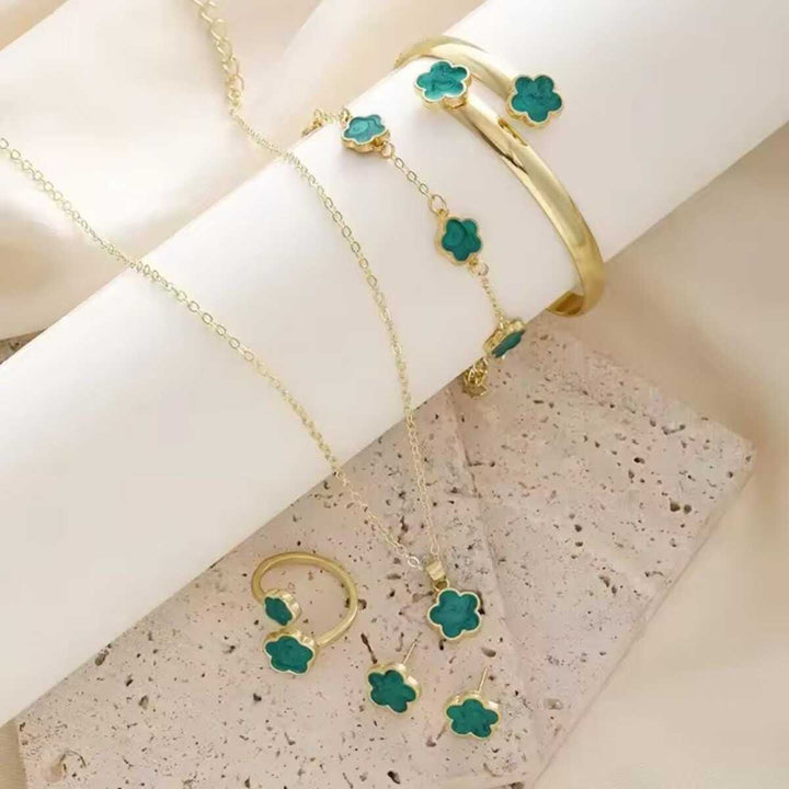 Elevate your style with the Black Petal Charm 5-Piece Set, a timeless jewelry collection featuring a bangle, bracelet, ring, necklace, and earrings. Designed with chic black floral motifs and golden accents, this set is perfect for both everyday wear and special occasions.