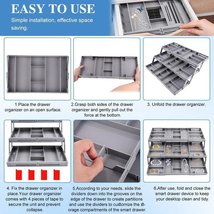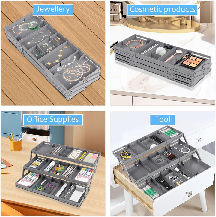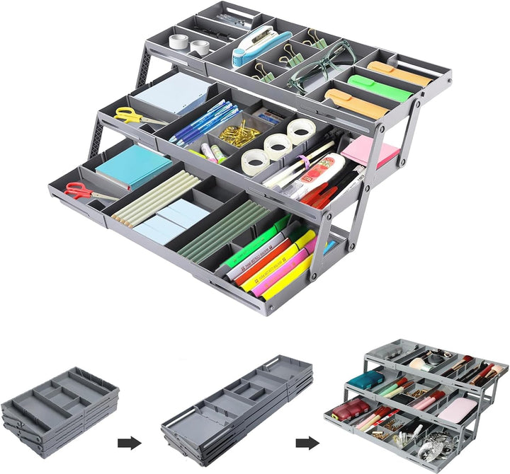 Discover ultimate organization with the Collapsible 3 Tier Multipurpose Expandable Storage Tray. This innovative organizer boasts a unique design with three expandable tiers that effortlessly fan out, revealing a wealth of compartments to store and sort your essentials. Crafted from durable plastic, it promises long-lasting performance and easy maintenance. Its collapsible design is a true space-saver, allowing the tray to compact neatly when not in use, making it ideal for stowing away in drawers or on shelves. Whether you're a hobbyist, a professional, or simply seeking to declutter, this versatile tray offers clear visibility and convenient access to all contents, from office supplies and cosmetics to crafting materials and small tools.