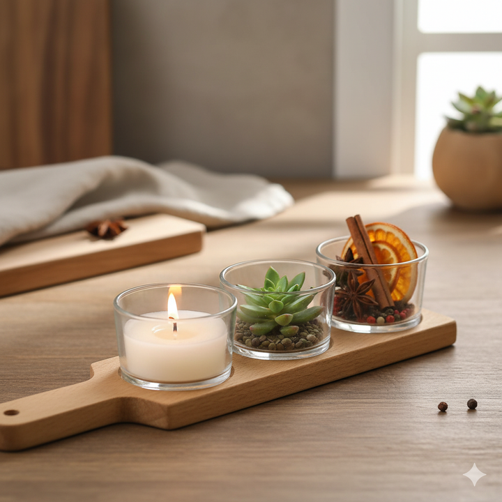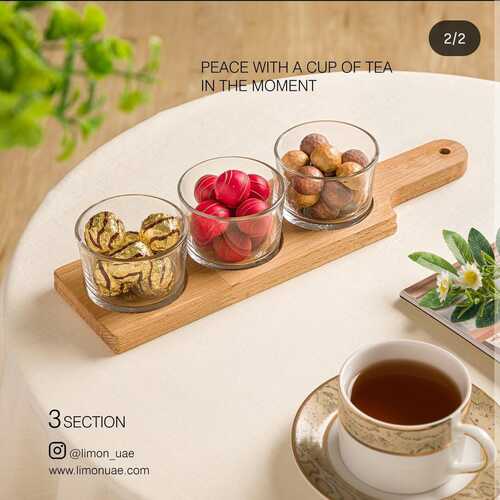 A stylish and functional serving set featuring three clear glass bowls arranged neatly on a natural wooden base with a sleek handle. Perfect for presenting dry fruits, candies, nuts, dips, and more, this set blends practicality with elegance for both daily use and entertaining.