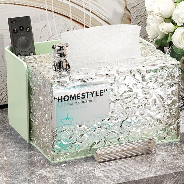 Bring elegance and order to your space with the GlacierView Tissue Box with Remote Holder. Featuring a sleek glacier-inspired frosted design, it doubles as a tissue dispenser and an organizer for remotes, glasses, or other small essentials. Durable, stylish, and versatile, it’s the perfect blend of modern décor and everyday practicality.