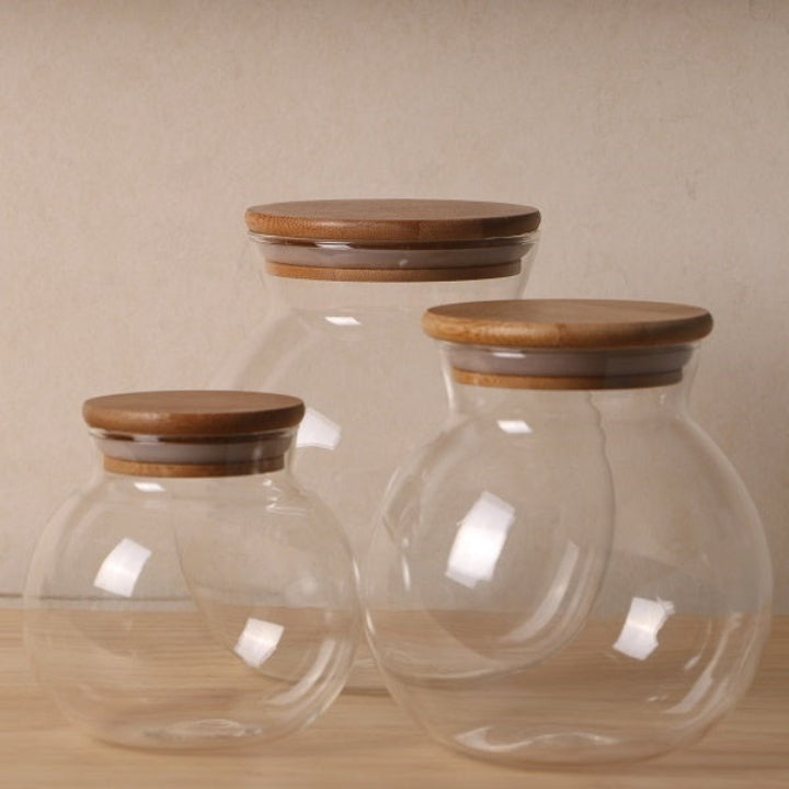 Experience the perfect blend of practical freshness, visual appeal, and natural elegance with our Round Pantry Airtight Glass Display Jars with Wooden Lids.