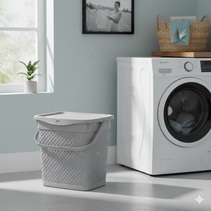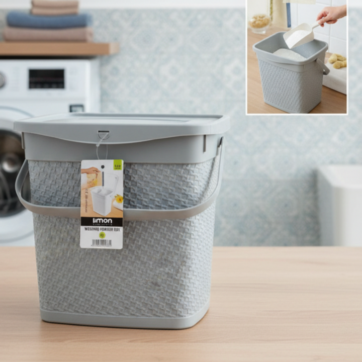 A versatile storage basket with a decorative woven texture, designed for organizing surf powder and various household items. It features a lid with a secure locking mechanism and a handle for easy transport and portability.