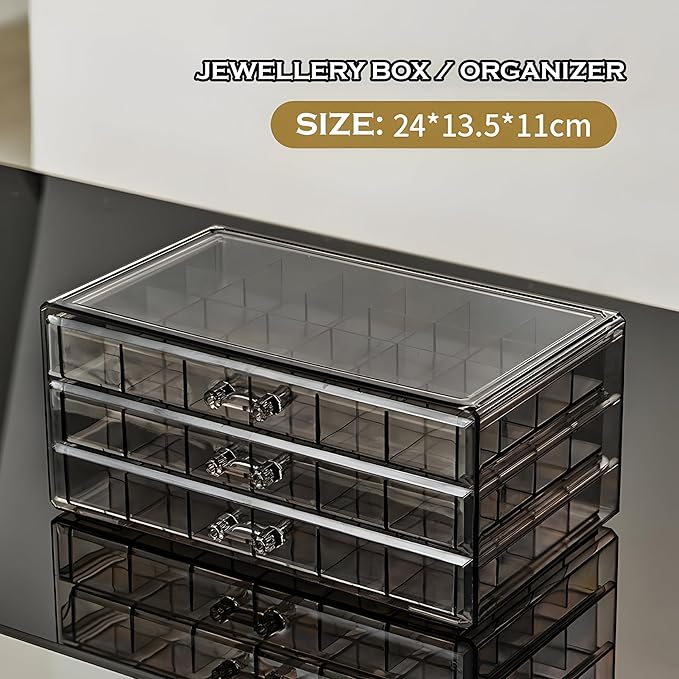 Stay organized and stylish with the Three Drawer Transparent Acrylic Jewellery Organizer—your perfect solution for safe storage and elegant display.
