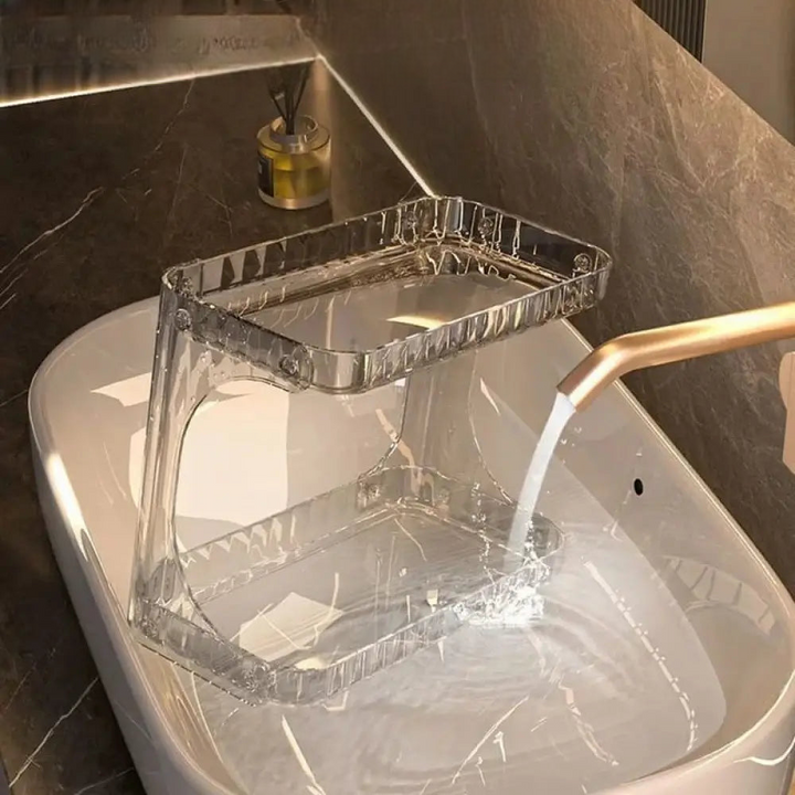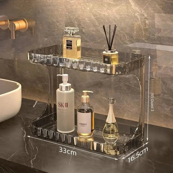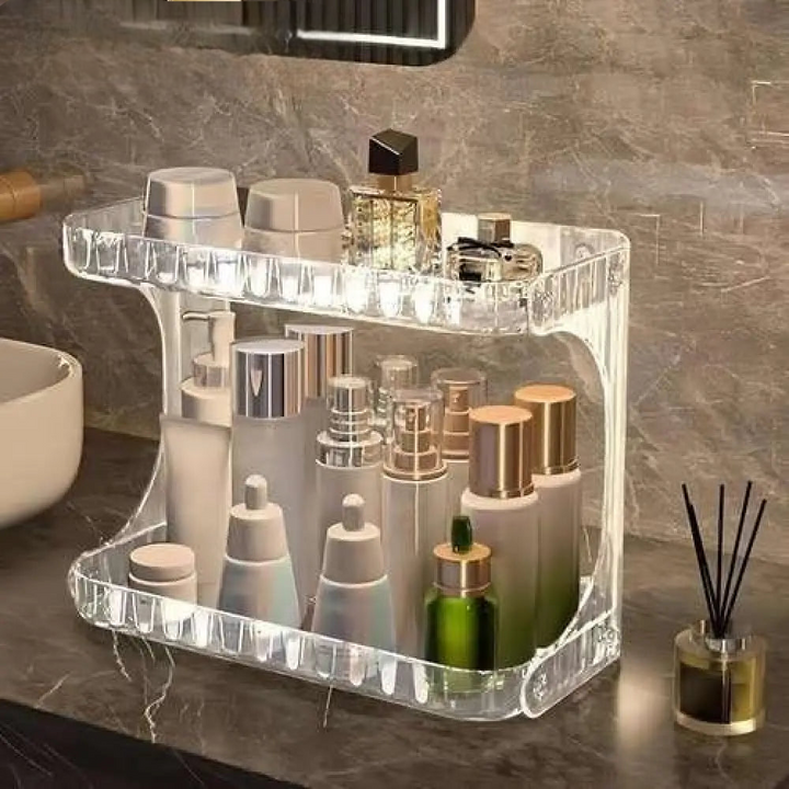 Elevate your beauty space with the 2 Layer Transparent Vanity Stand. This elegant organizer offers a clear, multi-tiered solution for displaying and storing your perfumes, cosmetics, and skincare essentials. Its modern design maximizes vertical space, adding sophistication and effortless organization to any vanity or bathroom.